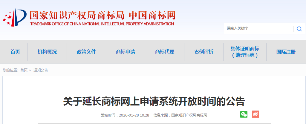 为更好地满足经营主体和社会各界对商标注册申请的需求,营造良好的营商环境,自2026年2月1日起,将商标网上申请系统业务提交时间由“08:00至20:00”延长为“08:00至22:00”,业务查询等功能全天开放。特此公告。 国家知识产权局商标局2026年1月28日