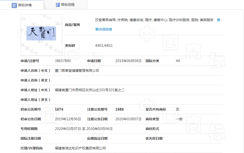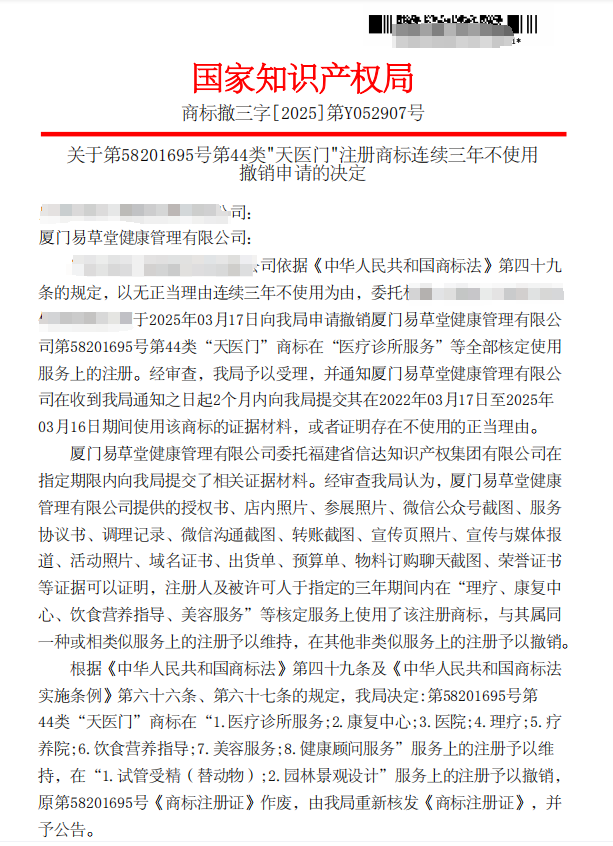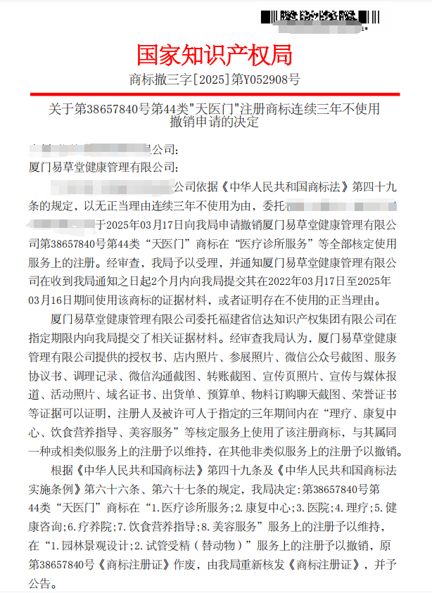 2025年11月14日我司代理报送厦门易草堂健康管理有限公司“天门医”商标撤三答辩案件,2025年11月20日在国家知识产权局的高效审查下,迅速取得圆满成功!这一结果不仅是对易草堂品牌核心权益的强力捍卫,更彰显了国家知识产权局的高效行政能力,以及我司在商标撤三答辩领域的专业实力与高效执行力。